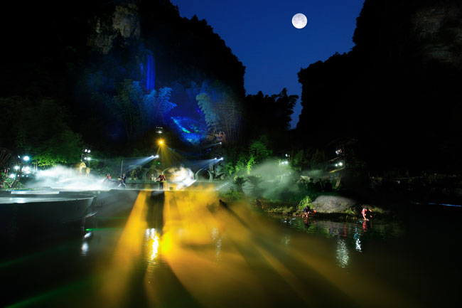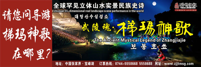 The Ancient Mystical Legend of Zhangjiajie 《武陵魂•梯瑪神歌》是一場(chǎng)記述土家族起源、演變、戰(zhàn)爭(zhēng)、生產(chǎn)生活等內(nèi)容的大型立體山水實(shí)景演出,揉合了音樂(lè)、舞蹈、文學(xué)等多種藝術(shù)形式,如幻如夢(mèng)的舞美燈光,搖曳生姿的原生態(tài)歌舞……濃縮了土家族數(shù)千年的發(fā)展歷史,400多名演員以自然淳樸的表演充分的展示了土家的民族文化特征,給游客帶來(lái)了耳目一新的感受。一場(chǎng)視聽的饕餮盛宴,一曲驚天地、泣鬼神的曠世古歌,給人山水文化光影視聽的享受。【出品:張家界梯瑪神歌文化傳播有限公司】
