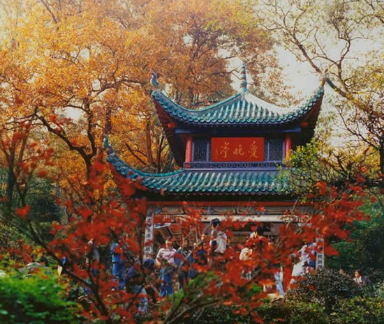 原名紅葉亭,又稱愛楓亭。在岳麓山岳麓書院后清風(fēng)峽的小山上。四周皆楓林,春時青翠,夏日陰涼,深秋則楓葉紅艷,別有桂趣。亭為清乾隆五十七年(1792年)建,因取唐杜牧“停滯不前車坐愛楓林晚,霜葉紅于二月花”詩意而名。光緒、宣統(tǒng)年間,湖南高等學(xué)堂臨督程頌萬將張南軒與錢南園游山七律詩刻于亭中方石上,題名“二南詩刻”,亭前石柱刻對聯(lián)曰:“山徑晚紅舒,五百夭桃新種得;峽云深翠滴,一雙馴鶴待籠來,”亭右有清楓橋,下面小溪叫蘭澗,1952年亭又經(jīng)修葺,朱欄藻井,煥然一新,毛澤東題有“愛晚亭”額。