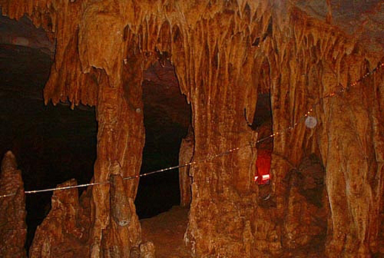 藏君洞為一大型天然溶洞,溶洞長25000米,已探明洞長4000m,洞內洞中有洞、洞中有河,迂回曲折,地下河流水潺潺,溶洞分布在石炭系中、上統碳酸鹽巖中,洞內鐘乳石十分豐富:石筍、石柱、石幔、石樓、石像比比皆是。洞內構造奇特,石鐘乳千姿百態(tài)、絢麗多彩,景觀奇秀,珍品奇絕,是我國少有的大型碳酸鹽巖巖溶洞穴之一。目前已開發(fā)的4000m洞穴中,由十二個大的溶洞群構成,由洞口往里有護君堂、惠帝殿、兩重天、南巡廳、不夜城、龍鳳宮、北國廳、江南廳、江河壩、閱兵場、國寶廳等溶洞景觀區(qū)。溶洞一般高5~30m,長60~100m,寬10~20m,面積60~200㎡。十二個溶洞沿地下河呈串球狀分布,洞與洞之間有巷道(地下河管道)相連,溶洞中景觀十分豐富,仿佛是一個瑰麗的地下宮殿。如護君堂內有“尚書帽”、“御馬”、“貓頭鷹”、“小羊羔”、“老夫妻”、“天宮浴盆”等景點,惠帝殿內由“斷劍石”、“龍椅”、“觀音立佛”、“觀音蓮花寶座”等,“蔬果長廊”中有形似花菜、白菜、絲瓜、茄子、黃瓜等石筍,不夜城內有乳白色石鐘乳巖溶坡面,龍鳳宮內有石幔、石柱琳瑯滿目及鐘乳石構成的似漢白玉“龍鳳石床”、“旭日東升”的浮雕石鐘乳墻、“燈籠群”、“攀龍柱”、“石蓮花”等,國寶廳巨型石柱等,巷道側壁唐僧師徒“西天取經”壁畫等,景觀類型齊全,是巖溶洞穴中具有典型地學意義的巖溶地貌景觀,屬國家級的地質遺跡景觀。