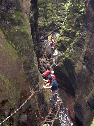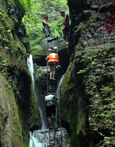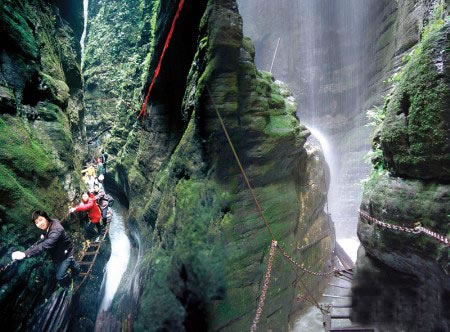 坐龍峽擁有中國(guó)第一條特種游道。所有游道均建于峽谷深處,依山取勢(shì),既經(jīng)細(xì)心雕琢聽卻又渾然天成。粗樸的板栗木棧道,可以讓你零距離的親近那一潭碧幽、聽聞山泉叮咚;精巧的跳墩,可以讓你媳戲流泉、觸感溪瀑;原質(zhì)的石坎道,讓你不得不調(diào)動(dòng)全部的身心能量悉心攀援、感悟峽谷;有驚無險(xiǎn)的鐵梯,讓你伴著腳下轟鳴的溪水,在驚怵中體味一份快慰。出口處的土家山寨,保留了古樸獨(dú)特的生活習(xí)俗。一塊臘肉就一口醇香的“苞谷燒”會(huì)讓你洗去所有的疲憊,在輕松中憨厚的主人向你講述過去強(qiáng)人出沒的故事......