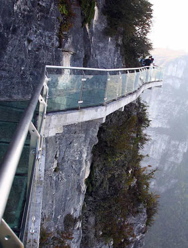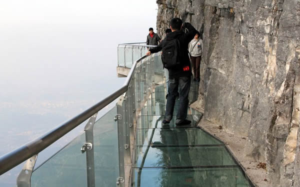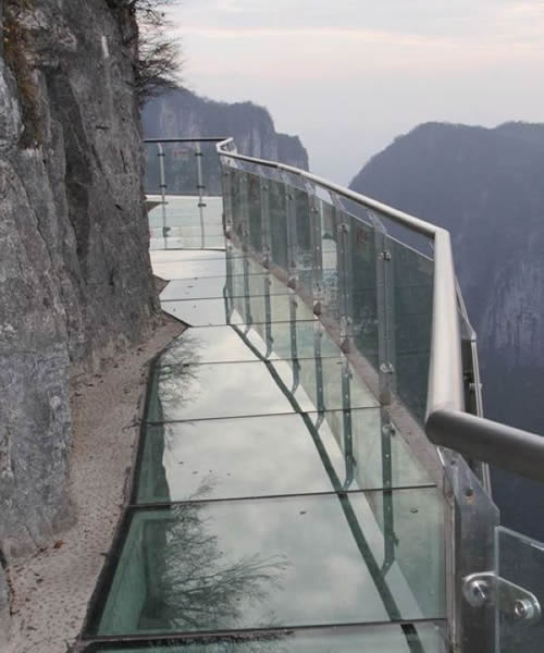 2011年10月1日,張家界天門山國家森林公園新建的玻璃棧道正式對游客開放。玻璃棧道懸于天門山頂西線,長60米,最高處海拔1430米。是張家界天門山景區(qū)繼懸于峭壁之上的鬼谷棧道、憑空伸出的玻璃眺望臺、從玻璃臺可以看見下面。玻璃臺伸出棧道有4-5米,專供游人拍照、橫跨峽谷的木質(zhì)吊橋后打造的又一試膽力作。為了讓游客零瑕疵的透過玻璃橋看到美麗的風(fēng)景,上橋的游客均要求戴上鞋套,以保持玻璃橋的透明和干凈。玻璃棧道的刺激震撼,可與舉世聞名的美國大峽谷玻璃走廊“天空之路”媲美,因而有了東方“天空之路”的美譽。