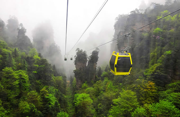 楊家界風(fēng)光 楊家界索道是世界自然遺產(chǎn)武陵源風(fēng)景名勝區(qū)繼天子山索道、黃石寨索道后的第三條客運(yùn)索道,上站位于八里坡游覽線劉家檐,下站位于中湖鄉(xiāng)野溪鋪村。該索道采用法國(guó),斔鞯涝O(shè)備,是世界頂級(jí)雙回路循環(huán)式配置八人車廂式索道,全長(zhǎng)1876米,上下站垂直高差517米,線路支架14個(gè),最高運(yùn)行速度6m/s,最大運(yùn)力為2300人/小時(shí),單程運(yùn)行時(shí)間5.2分鐘,是目前國(guó)際最先進(jìn)的客運(yùn)索道。