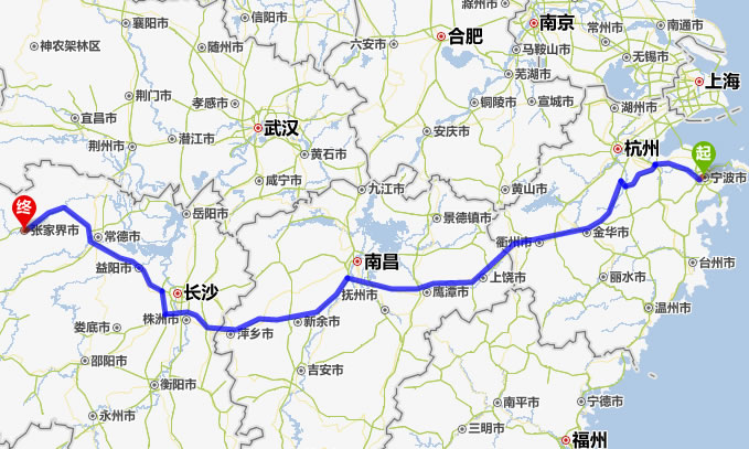 左右,沿途經過寧波——紹興市——金華市——衢州市——上饒市——鷹潭市——新余市——宜春市——萍鄉(xiāng)市——株洲市——湘潭市——寧鄉(xiāng)縣——益陽市——常德市——慈利縣——張家界。