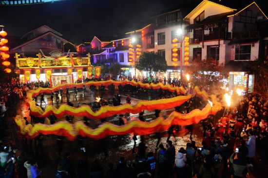 火龍出場(chǎng),街區(qū)狂舞;盤(pán)龍點(diǎn)睛,眾人祈福。12月21日,農(nóng)歷冬至,當(dāng)天夜晚在旅游勝地張家界武陵源區(qū)溪布老街?jǐn)[手堂廣場(chǎng)啟動(dòng)的 “武陵腔調(diào):趕火趕戲趕大年”活動(dòng)儀式上,一條全身似火的長(zhǎng)龍?jiān)诮倜良覂号奈鑴?dòng)下 “閃亮”登場(chǎng),格外耀眼。據(jù)了解,這條長(zhǎng)龍身有香味,全長(zhǎng)108米,是目前世界最長(zhǎng)的香火龍。